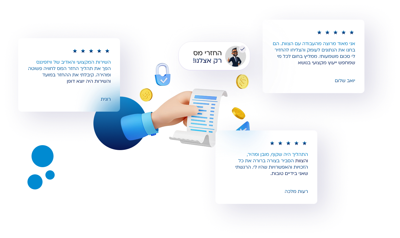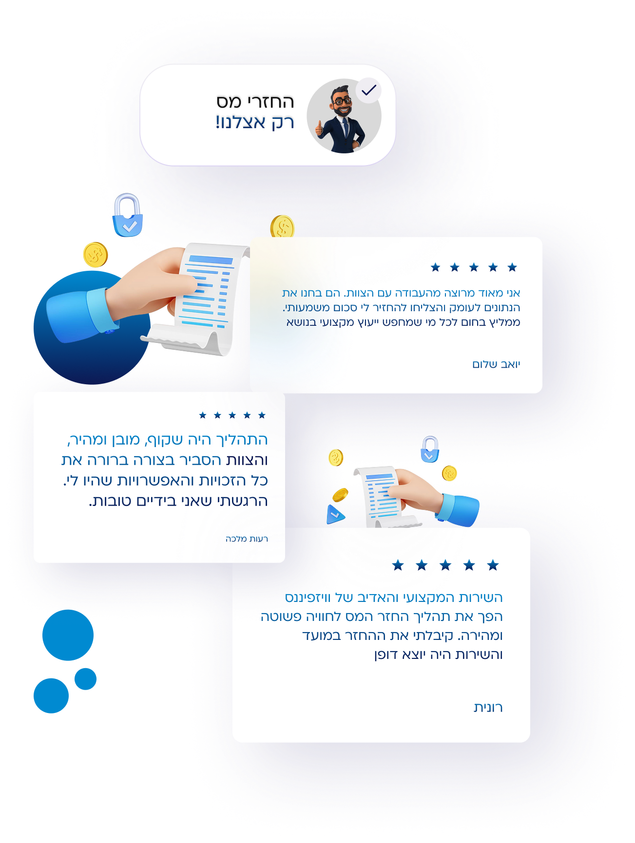 ברגע שהכסף נכנס לחשבון הבנק שלכם, אתם יכולים לנשום לרווחה ולדעת שהכול נעשה בצורה מקצועית, מהירה ושקופה. אנחנו מאמינים בזכות שלכם לקבל את מה שמגיע לכם, ולכן ממשיכים ללוות אתכם גם אחרי שההחזר כבר אצלכם – כדי לוודא שאתם מרוצים לחלוטין.